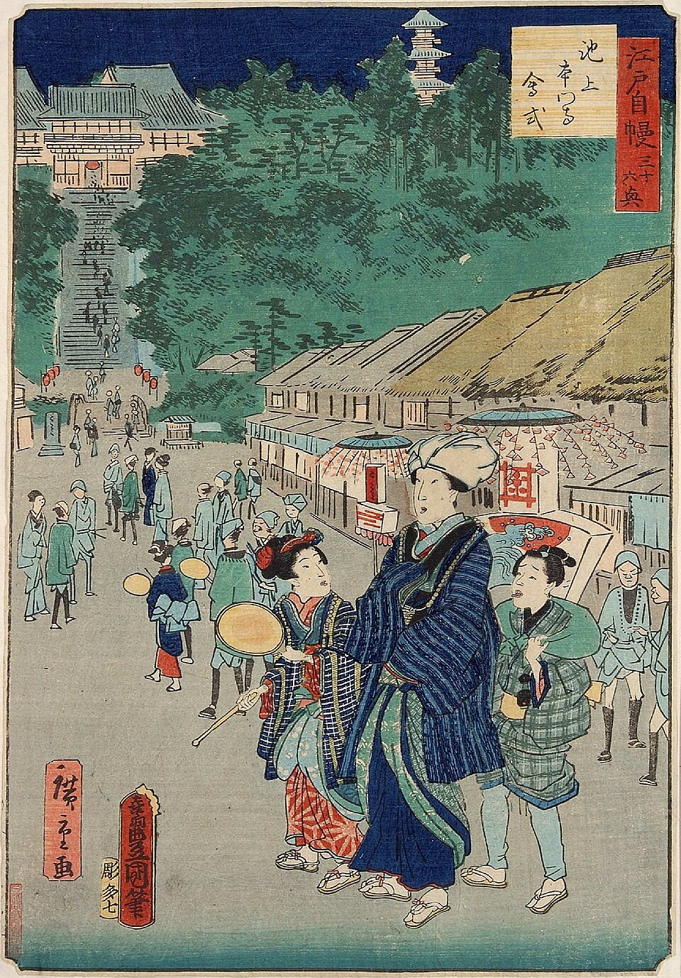 This 19th century postcard depicts pilgrims approaching Ikegami Honmon-ji temple for its annual festival commemorating the life and passing of Kamakura-era reformer Nichiren Daishōnin (日蓮大聖人).