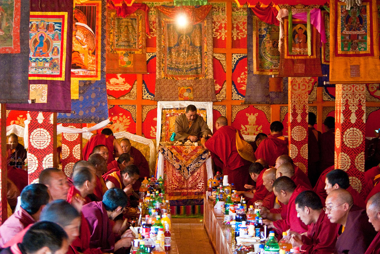 A group of red-robed monks share sodas and snacks at a monastery event in Kham in 2009. One monk is offering a drink to the lama, seated high and center, while the rest of the monks are lined up behind low tables on his left and right. The painted banners hanging overhead represent their main meditation practice: tantric visualizations which are considered dangerous without the guidance of a wise master. (Antoine Taveneaux, CC BY-SA 3.0)